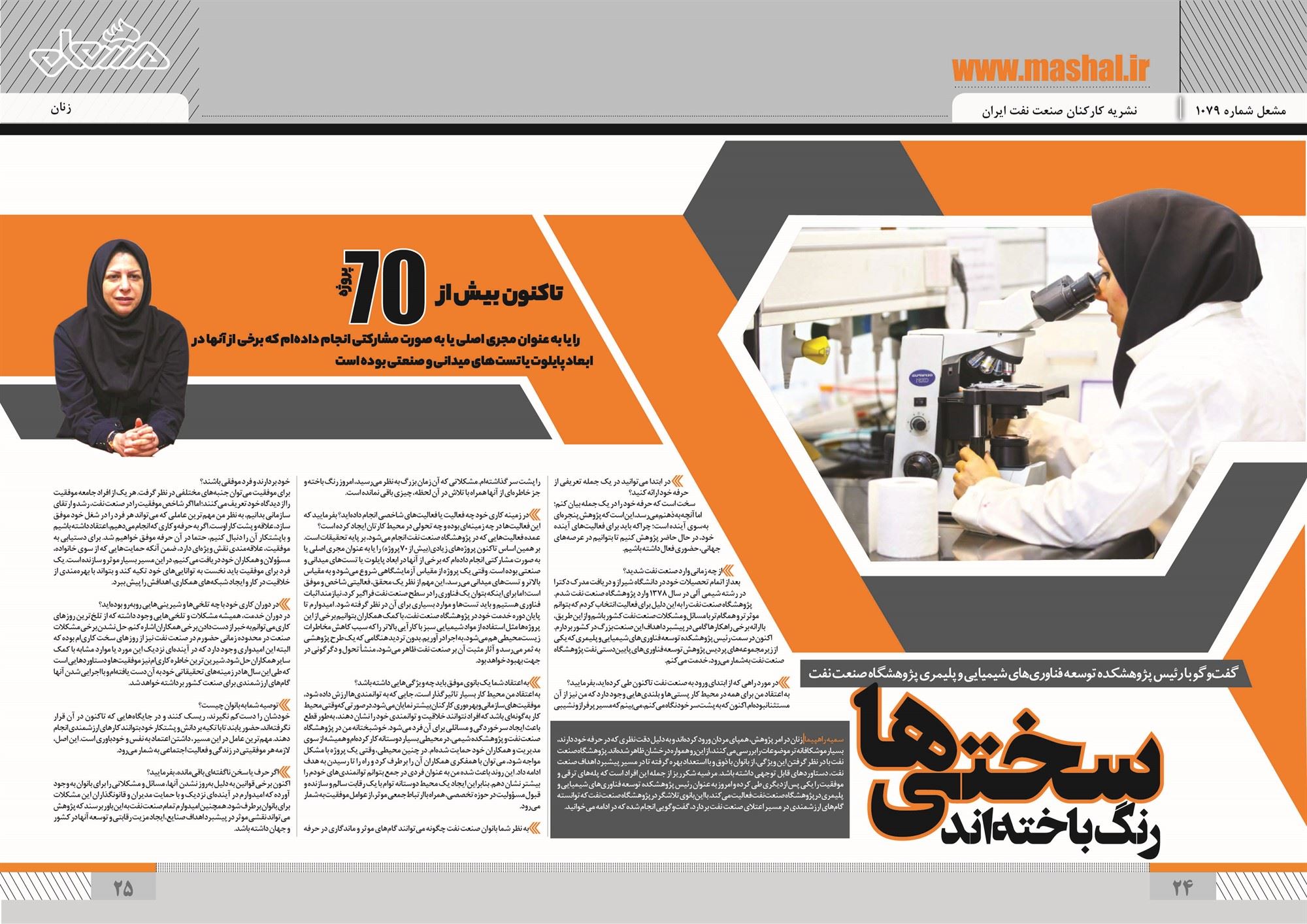 سمیه راهپیما زنان در امر پژوهش، همپای مردان ورود کرده اند و به دلیل دقت نظری که در حرفه خود دارند، بسیار موشکافانه تر موضوعات را بررسی می کنند، از این رو همواره درخشان ظاهر شده اند. پژوهشگاه صنعت نفت با در نظر گرفتن این ویژگی، از بانوان با ذوق و با استعداد بهره گرفته تا در مسیر پیشبرد اهداف صنعت نفت، دستاوردهای قابل توجهی داشته باشد. مرضیه شکرریز از جمله این افراد است که پله های ترقی و موفقیت را یکی پس ازدیگری طی کرده و امروز به عنوان رئیس پژوهشکده توسعه فناوری های شیمیایی و پلیمری درپژوهشگاه صنعت نفت فعالیت می کند. با این بانوی تلاشگر درپژوهشگاه صنعت نفت که توانسته گام های ارزشمندی در مسیر اعتلای صنعت نفت بردارد، گفت و گویی انجام شده که در ادامه می خوانید.